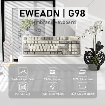 SEUNKWANG Teclado para jogos EWEADN G98, teclado cremoso com fio com retroiluminação RGB arco-íris, botão de mídia, teclado de computador de membrana de 98 teclas para Mac Xbox PC Gamer – branco e