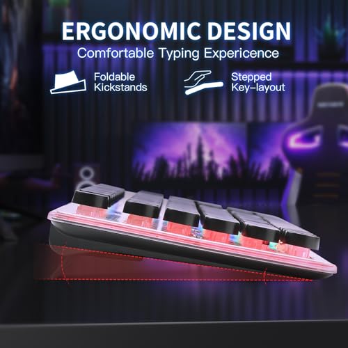 – ❤ Teclado ergonômico de 104 teclas ❤ Design ergonômico com 2 pés angulares na parte traseira do teclado, linhas suaves, sensação confortável e antifadiga. 12 combinações de teclas multimídia, 19 teclas sem conflito. 12 combinações de teclas multimídia facilitam a operação do seu trabalho ou jogo e melhoram a eficiência.