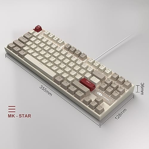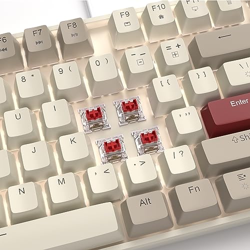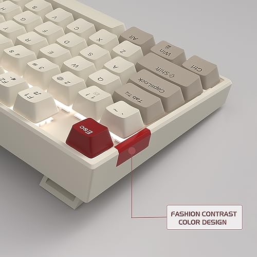 – [Teclados mecânicos ergonômicos]: layout elegante retrô cinza branco mesclado de 75%, vem com 16 teclas vermelhas extras, tecla de suspensão antiderrapante de injeção dupla, design à prova de respingos, painel de metal durável o suficiente para protegê-lo de arranhões, também ângulo de digitação ajustável dos pés com suporte firme.